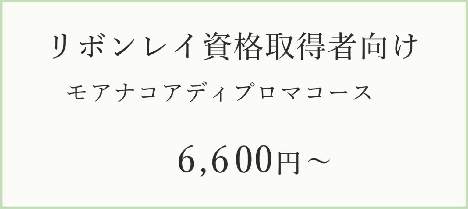 Instagramでも人気の「ハワイアンリボンレイ 」リボンクラフトの中でもトップクラスの技術力を身に付け、応用が利く「リボンレイ」リボンを折り畳んだり編んだり縫い進めることで、カラフルなお花等を形成しレイに仕上げます。ディプロマコースでは、作る楽しみを味わいながらしっかりと技術を身につけることができます。 ✓ハワイが好きな方✓趣味でもしっかりリボンレイメイキングの基礎を学びたい✓お教室開講して講師として活躍したい✓リボンレイ作品を販売したい✓作りたいレイがある✓自宅教室、週末起業に興味がある ハワイ好きな皆さまリクエストにお応えしながらレッスンさせていただきます。リボンレイの技術的なことはもちろんですがハワイの資材購入先、ハワイのオススメのお店まで知識や技術を惜しみなくお伝えいたします。写真撮影、ホームページ作成などのお教室運営などをお考えの方のご相談も承っております。 COURSE 2つのコースをご用意しております。 モアナコアyoshimi先生による技術指導付きDVDに基づき、レッスンを行います。 ■レッスンをご受講後にご自宅に帰られてからでもyoshimi先生の手元を確認いただきながら課題を進めていただくことが可能です。■DVDでも学習できることであやふやな記憶に頼ることなく、正しい作り方を習得いただけます。■将来インストラクターとしてご活躍いただく際に、内容を確認することができます。■ご自宅での復習にもご利用いただけます。 モアナコア通信講座と同じ料金で、直接対面レッスンをご受講いただけます 遠方の方には、一部zoomでもご対応しております。レッスン終了後、課題を進めるにあたりご不明点等がございましたらいつでもzoomにてご質問いただけます。遠方の方、お忙しい方もご安心してご受講いただくことが可能です。 資格認定の流れ Diploma・Certificateの違い 『ディプロマ』取得者「カリキュラムを全て修了した」という意味合いでの証明とはなりますが、 単発レッスンなどインストラクラーとしての講師活動は禁止されております。 『サティフィケート』取得者モアナコアのサティフィケートは、ハワイのリボンレイ創始者である キャロルミト先生と繋がりを持つことの出来る、キャロル先生公認の資格です。 *モアナコアファミリーの一員(注記1)となり、モアナコア公認(=キャロル先生公認)のお教室として活動することが可能となり、ディプロマコースを開講し、 ご自身が取得された資格と同様のディプロマを発行することが出来ます。(注記1)現在、リボンレイ創始者キャロル・ミト先生は、キャロル先生のお名前を使用しての協会設立等認めておられません。モアナコアでは、リボンレイを一緒に楽しむ仲間(モアナコアファミリー)として位置付けしております。 Moanacoa Certificateについて モアナコア リボンレイ サティフィケートは、リボンレイ創始者キャロル・ミト先生のブロンズ サーティフィケートと同等の価値をもつ認定された公認ライセンスです。リボンレイ インストラクターとして教えることができるライセンスキャロルミト認定モアナコア・インストラクターとして活動できます。サテフィケート取得後は、ハワイアンネームがMoana Koa石丸プウマイカイよしみより授与されます。 Honolulu Ribbon College,Moana Koa Yoshimi先生 09年ハワイレイデイコンテストにて優勝。リボンレイデザイナー&先生として活躍中、美意識の高い女性に圧倒的支持を得ている。・Honolulu Ribbon College,Moana Koa & Coリボンレイデザイナー&インストラクター ・2012年1月リボンレイ創始者Carole Mito先生よりダブルダイアモンドの称号 Moanacoa Certificatを取得するメリット 「モアナコア」よりハワイアンネームを命名して頂き、『モアナコア公認のリボンレイインストラクター』として活動の場が広がります。 モアナコア公認(=キャロル先生公認)のお教室として活動することが可能となり、ディプロマコースを開講し、ご自身が取得された資格と同様のディプロマを発行することが出来ます。レッスンで規定レベルに達したあなたの生徒様に【ディプロマ】を発行することができます。 その後、お教室でサティフィケートを取得されたい生徒さまを輩出された場合は、【キャロルミト先生認定モアナコア リボンレイ ブロンズ サティフィケート】モアナコア代表であるYoshimi先生へご推薦いただくことができます。 なかなかお忙しかったりでハワイに行けないでも日本で数回行われるYoshimi先生の最新作品、月に一度行われる復習ワークにご参加いただけことで日本でもご卒業後にもスキルアップが可能です。 別途、サティフィケート取得後はモアナコア奨励プログラム(キャッシュバック)に参加できます。 (詳細は、ご質問くださいませ。) 「モアナコア」よりハワイアンネームを命名して頂き、『モアナコア公認のリボンレイインストラクター』として活動の場が広がります。 モアナコア公認(=キャロル先生公認)のお教室として活動することが可能となり